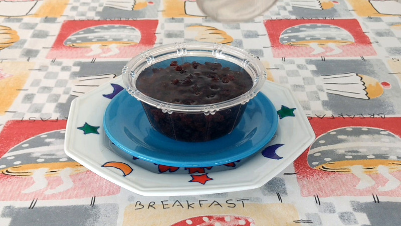 Coloque em uma vasilha as passas, adicione água o suficiente apenas para cobri-las e o sumo do limão.