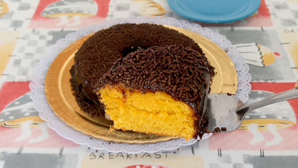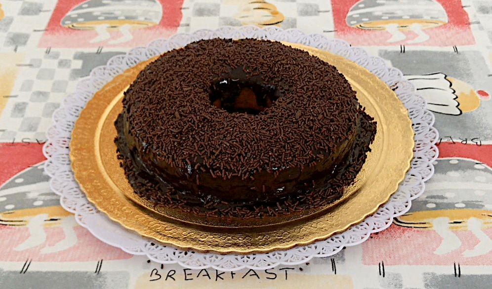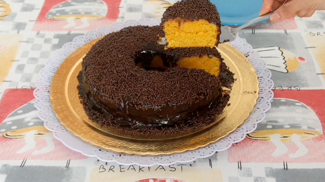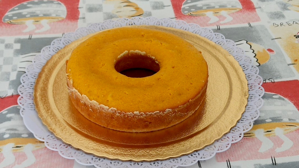 Usei uma forma com furo no centro, porque acho que o calor do forno se dispersa melhor sobre o bolo, dando mais chance de não “solar”, ou seja, não ficar duro, sem maciez. Entretanto, use a forma de sua preferência.