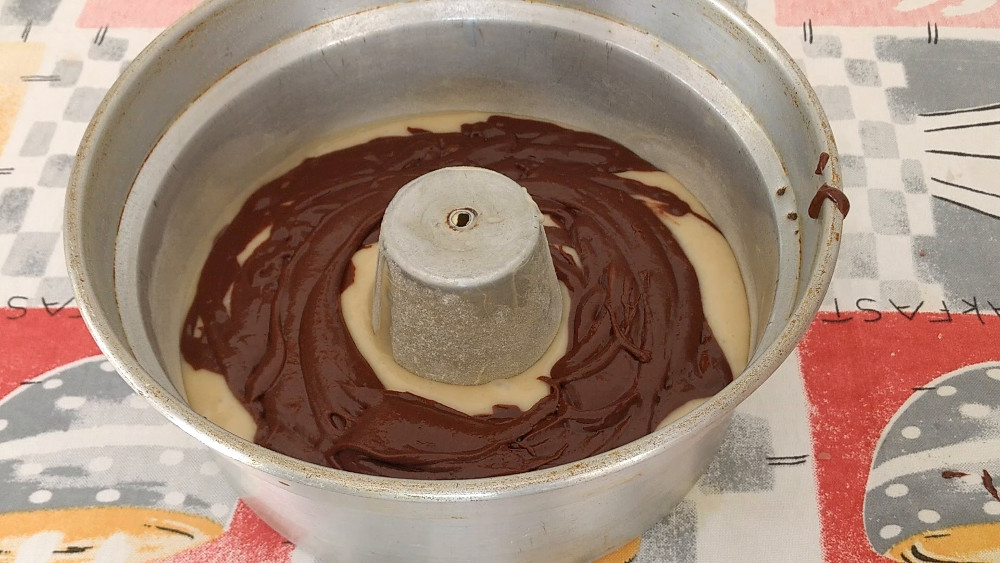 Depois despeje a massa de chocolate por cima da massa branca, fazendo movimentos circulares ao redor do furo.