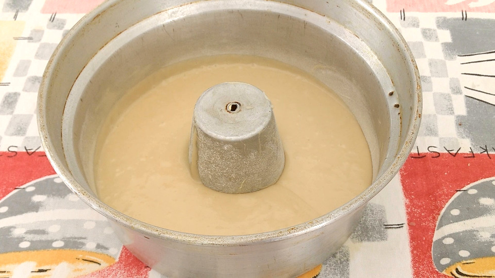 Despeje a massa branca em uma forma com furo central, untada com óleo vegetal e farinha de trigo.