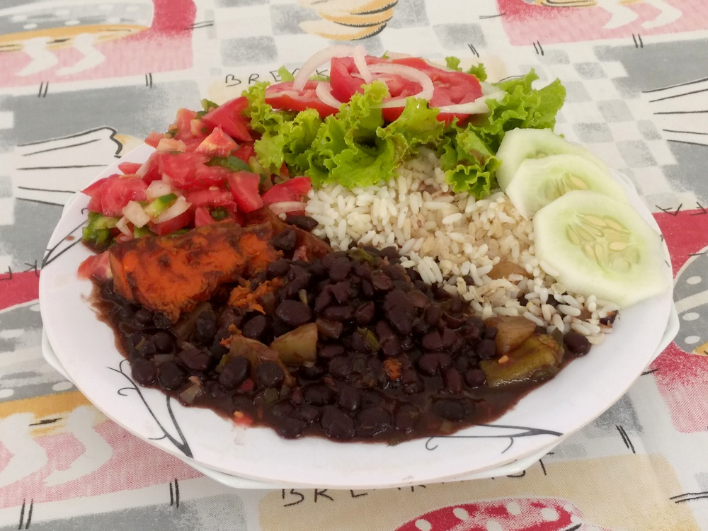 • Acompanhe este feijão preto com arroz, uma salada de alface (gosto da alface americana) com tomates e cebola, um vinagrete e pepinos temperados com azeite de oliva e limão.