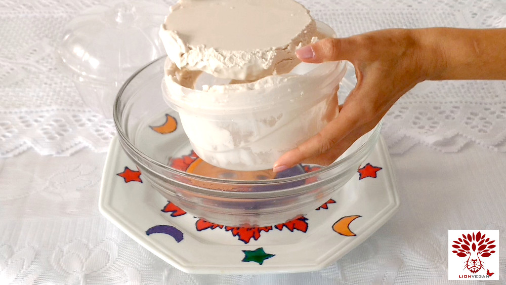 4–Após as 24 ou 48 horas, retire a vasilha da geladeira, jogue fora a parte líquida e guarde em um recipiente a parte sólida que é o óleo de coco.