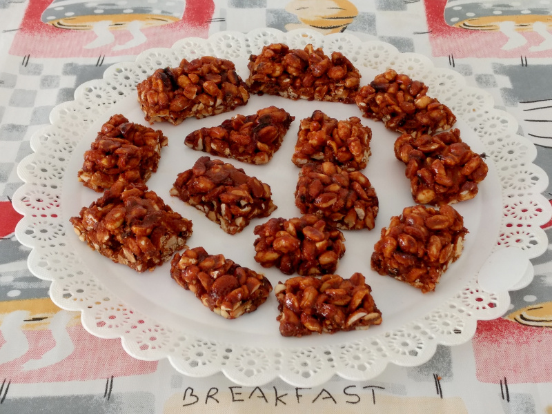 - Despeje em uma assadeira untada com óleo vegetal e quando começar a endurecer, corte os pés de moleque em quadrados.
