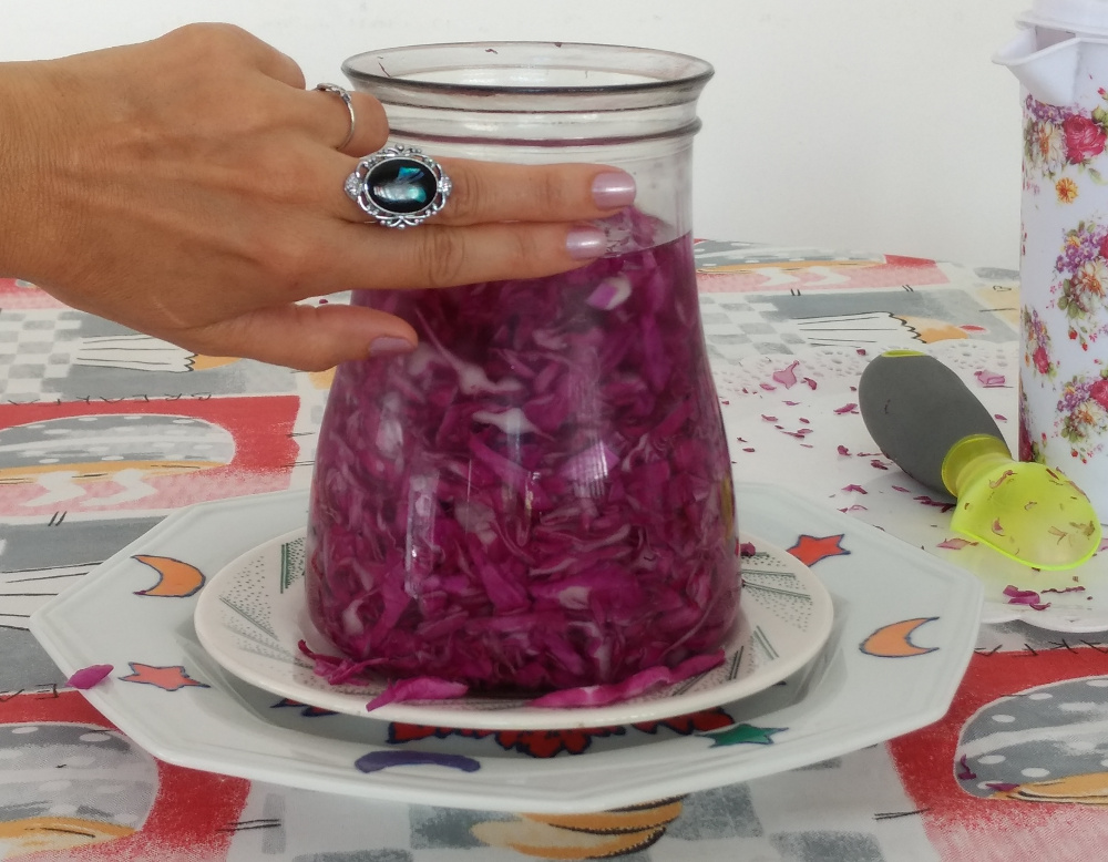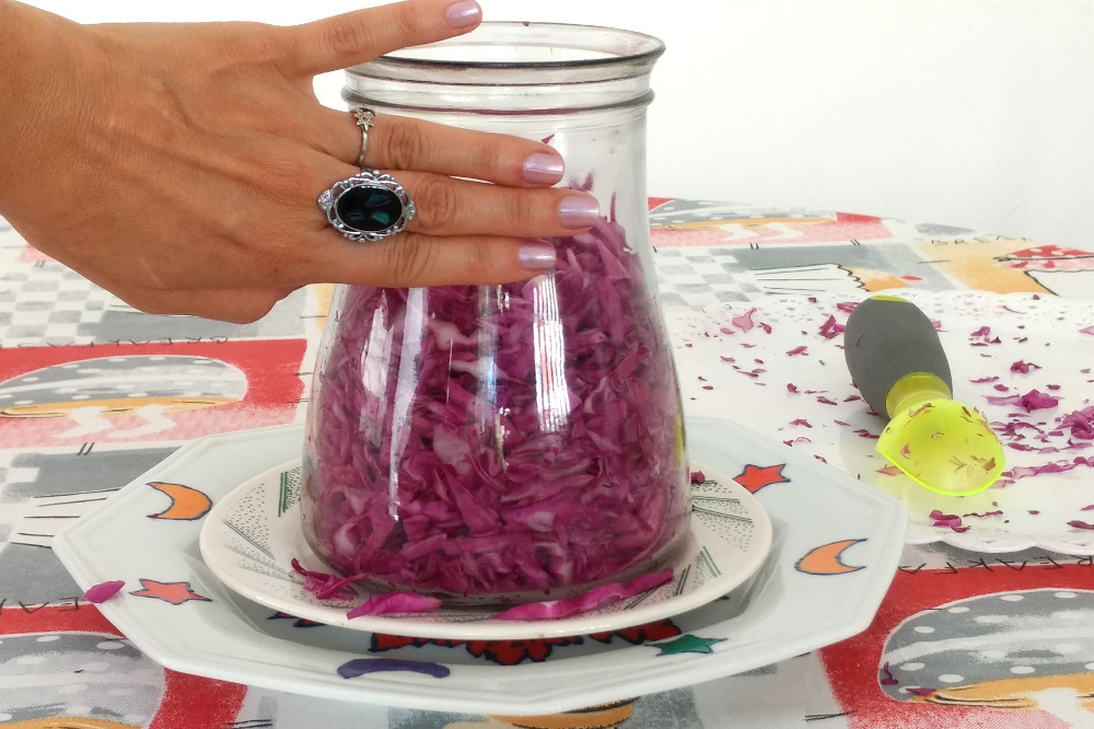 • Coloque em um frasco de vidro o repolho picado, socando com a ajuda de um socador e deixando três dedos para encher o vidro.
