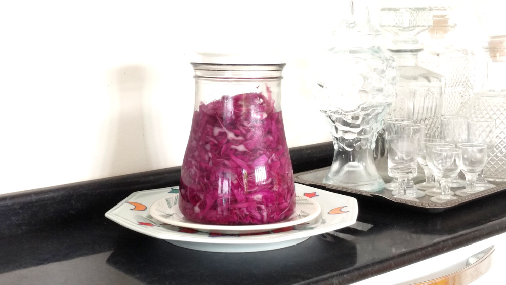 • Deixe o repolho fermentando durante dois a três dias em um local com sombra e sem mexer. Caso a temperatura do ambiente esteja alta serão necessários apenas dois dias de fermentação. O melhor lugar para deixar o Rejuvelac é em um local sem receber a luz direta do sol.