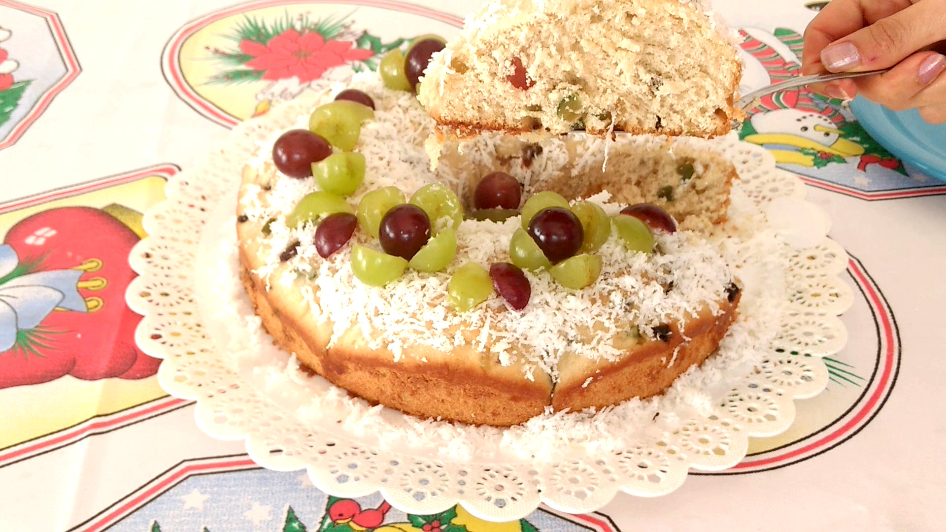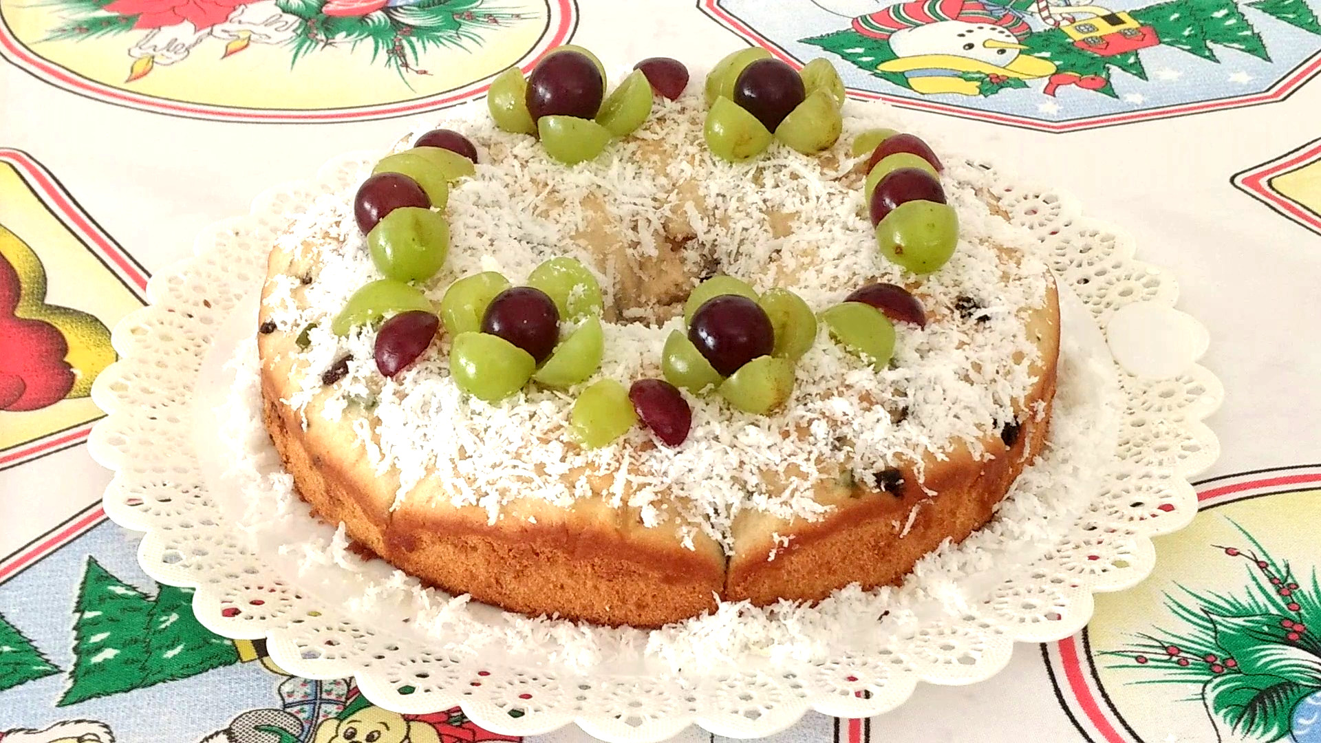 Despeje a cobertura sobre a rosca e decore com o coco ralado, as passas e as uvas . Usei uvas verdes e vermelhas para dar um bonito visual. Está pronta a nossa deliciosa Rosca Natalina Vegana.