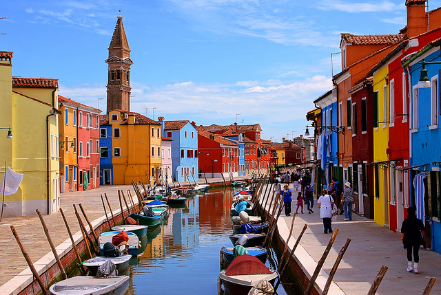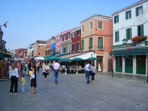 Burano é considerada a mais colorida ilha da laguna. As casas são pintadas com uma mistura de cores quentes e intensas, como a famosa Casa Bepi. A Via Badassare Galuppi é a principal rua, pois neste local encontram-se barracas vendendo rendas e restaurantes ao ar livre.