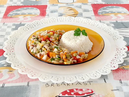 Normalmente como esta salada de feijão fradinho com arroz integral ou parboilizado, mas se desejar pode comer sem acompanhamentos, pois esta salada é muito nutritiva.