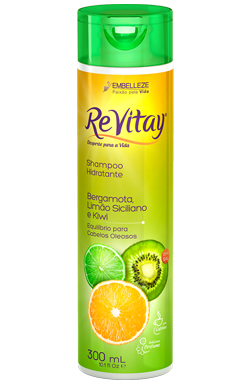 O Shampoo ReVitay Hidratente de Bergamota, Limão Siciliano e Kiwi posssui um mix de frutas (bergamota, limão siciliano e kiwi), que combate à oleosidade capilar, promove a hidratação e reequilíbrio dos fios.